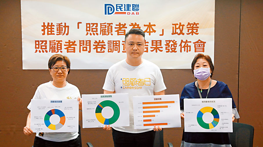 (照顾患病父亲)有好大压力,但其他同住的家人亦未能够协助,当时亦无法搵到人可以倾诉!”前照顾者Rita忆述之前照顾脚部严重溃烂的父亲时一度感触落泪。她说,当时自己既要照顾父亲,又要兼职帮补家计,极为频扑,缺乏支援,只靠政府为照顾者提供一些福利,让他们稍有喘息的空间。民建联一项调查显示,有近四成照顾者每日投放10小时或以上以照顾亲人,超过半数受访的照顾者表示最大困扰是休息不足,逾四成人情绪得不到纾缓,三成受访者因家庭收入不足而入不敷支。他们建议政府推行“照顾者为本”政策支援照顾者,在全港十八区设立照顾者支援中心和暂託服务,以及推出“照顾者通行证CARER'S PASS”让照顾者获得交通及医疗等优惠,增加“照顾者津贴”金额,减轻他们的经济压力。