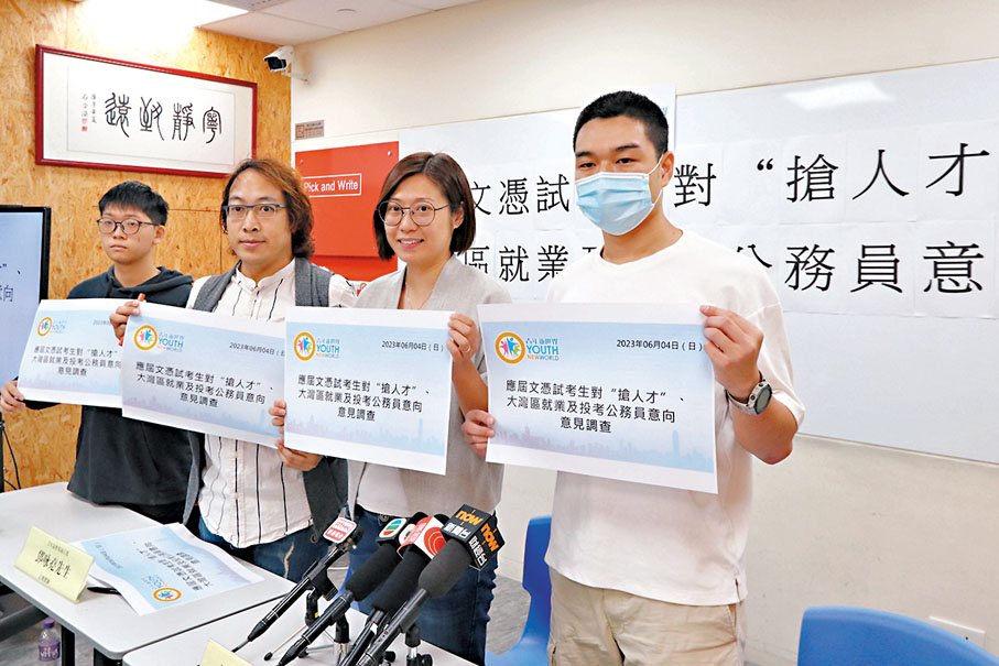 一直致力为基层青少年服务的团体「青年新世界」日前建议特区政府应重视建立内地港生人才库,鼓励内地港生回流。该团体上月透过真人电话问卷调查逾360名应届文凭试考生会员,了解他们对人才及劳工议题的看法,昨日公布的调查结果显示,不足三成文凭试毕业生打算毕业后优先考虑投考公务员。团体呼吁特区政府加强招聘在内地大学毕业的香港学生,建议在武汉、广州及厦门等港生相对集中地区增设公务员考场。对于特区政府早前宣布放宽大学生投考公务员要求,容许大学生毕业前一年投考部分职位,「青年新世界」表示欢迎,认为有助政府更早吸纳人才,同时让青年大学生对未来事业发展有更好规划。
