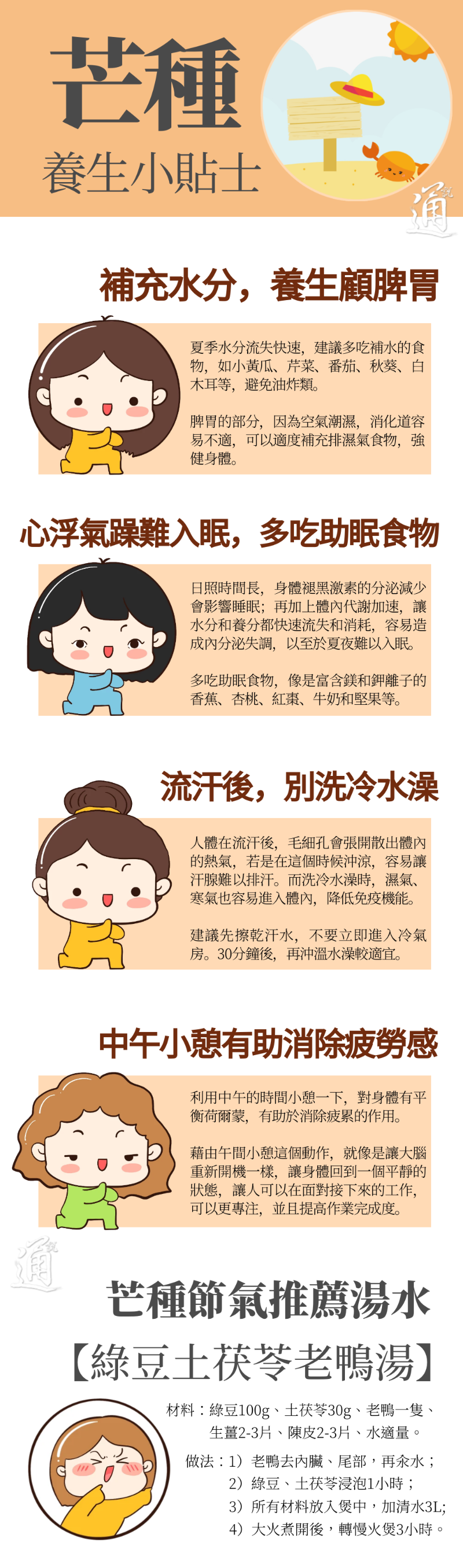 此时梅雨季进入尾声,但雨天仍会继续在我们身边。炎热的天气让热对流上升,带来的午后雷阵雨仍然不容小觑。环境和身体仍然充满湿气,保养的方法,要延续“小满”节气,顺着日出日落“晚睡早起”(可以不用太早睡,但尽量不超过晚上11点)。下午3点前,建议小睡一下补充体力。一起来了解一下芒种养生重点吧!