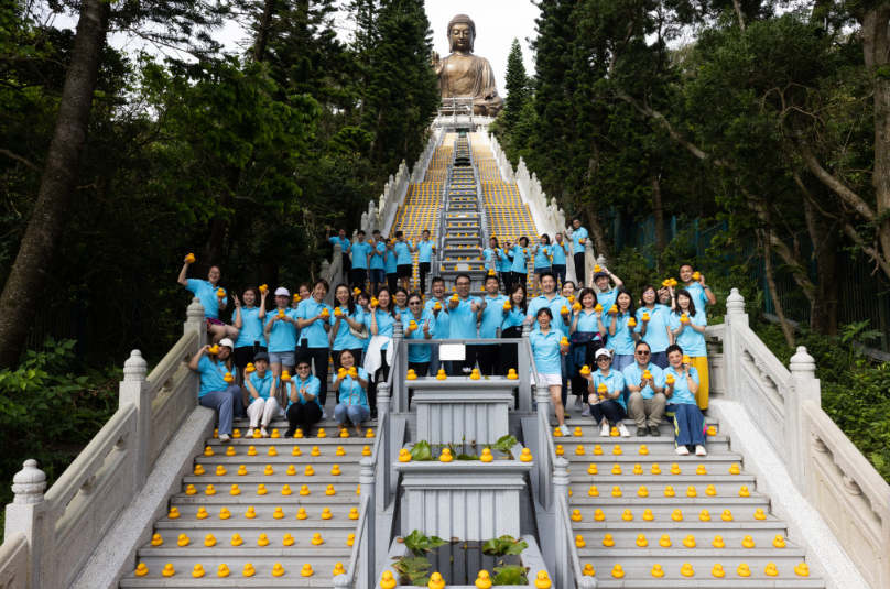 hk_c_image.png此次橡皮鸭快闪天坛大佛活动由昂坪360义工队发起,与社福机构邻舍辅导会的义工们,近50名义工共同完成,传递橡皮鸭友爱大同的正面讯息予社会各界。义工们合力将近五千只橡皮鸭排列在全球最高的户外青铜坐佛天坛大佛下的268级石阶,与大佛合照,场面壮观!