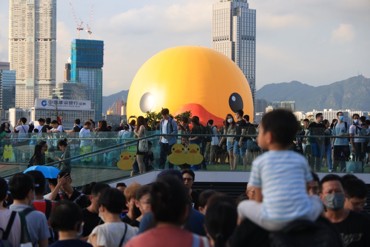 受炎热天气影响要放气避免风险的巨型黄色橡皮鸭一度重新充气,已经完成检查。主办方表示,黄色橡皮鸭将再次在维港海面展出。