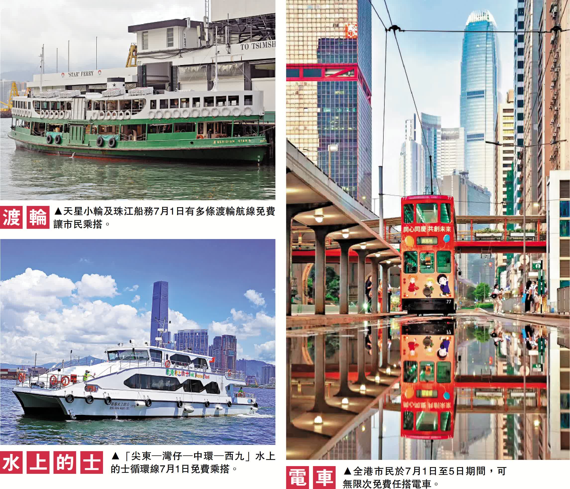 ☆ 7月1日当日,免费乘搭天星小轮往来湾仔及尖沙咀;免费乘搭富裕小轮「香港水上的士航线」及往来中环-红磡、屯门-大澳、北角-观塘等多条航线
