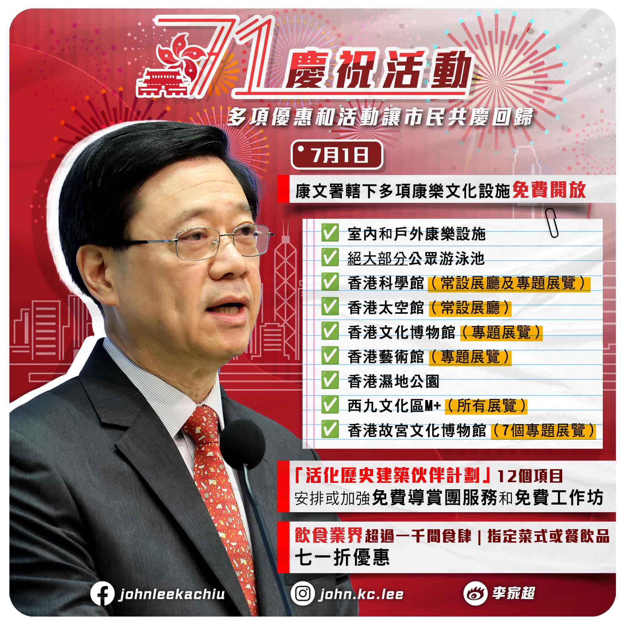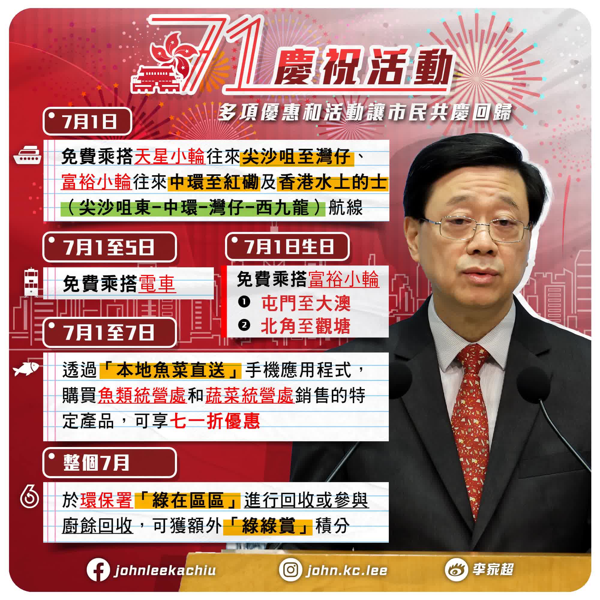 行政长官李家超今日(20日)出席行会前见记者时表示,为庆祝香港回归祖国26周年暨香港特区成立26周年,特区政府及公营机构将于7月1日起一连7日带头推出多项优惠活动。活动包括: