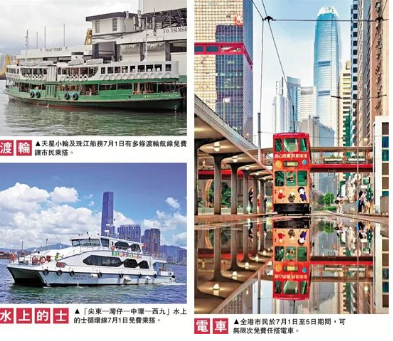 7月1日当天,免费乘搭富裕小轮“香港水上的士航线”及往来中环-红磡、屯门-大澳、北角-观塘等多条航线