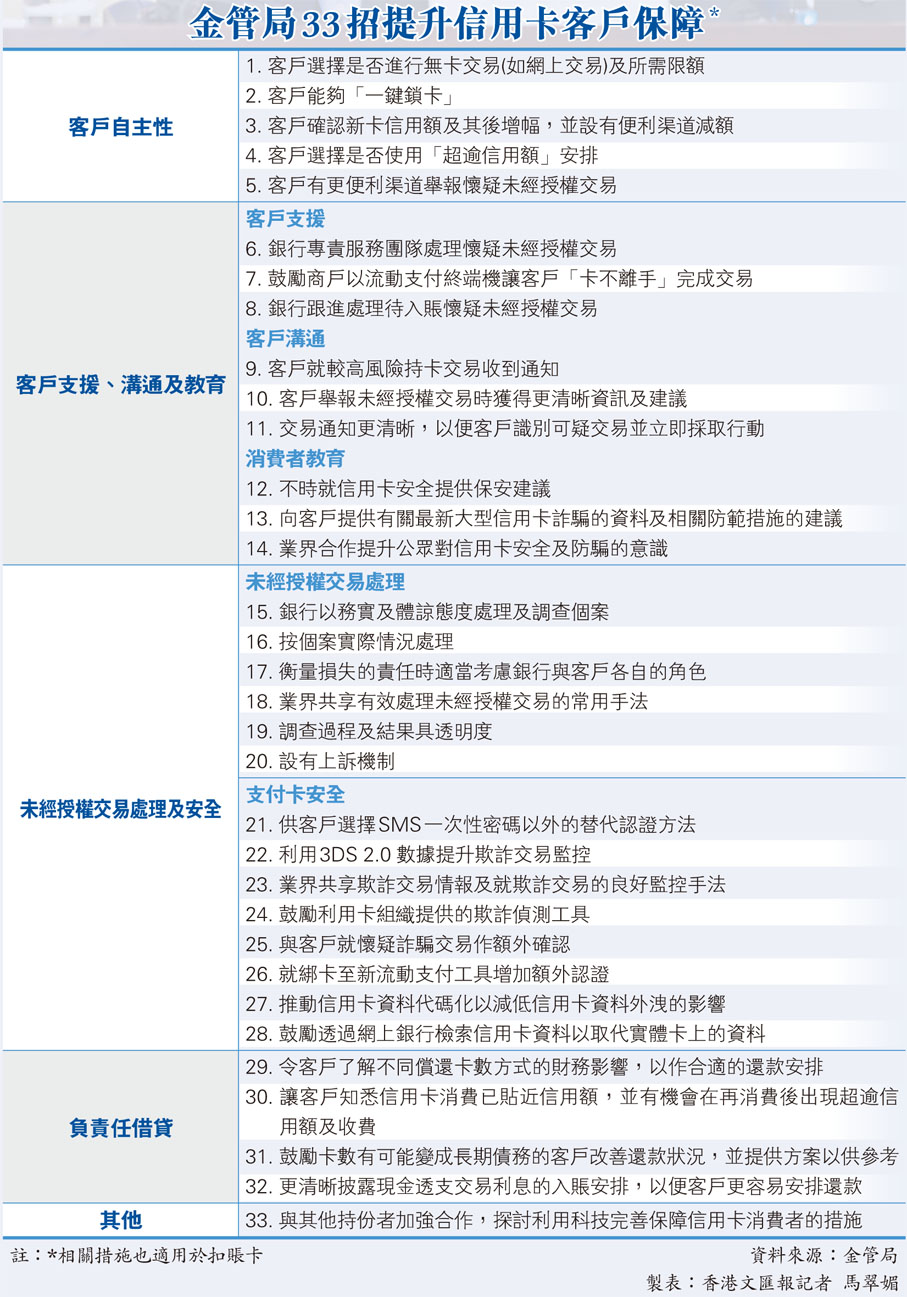 骗徒手法层出不穷,信用卡骗案是重灾区。金管局公布,今年首5个月收到与诈骗相关的银行投诉中,约75%是与信用卡未经授权交易有关,其余25%主要包括即时通讯的钓鱼讯息、求职骗案及投资骗案等。金管局昨伙银行界推出33招提升信用卡客户保障措施,主要涉及四大范畴,包括客户自主性、客户支援、未经授权交易处理及负责任借贷等,当中除了早前已公布的“防盗用7招”外,亦额外加了26招,较瞩目的包括信用卡资料代码化、实体信用卡不显示卡号等。