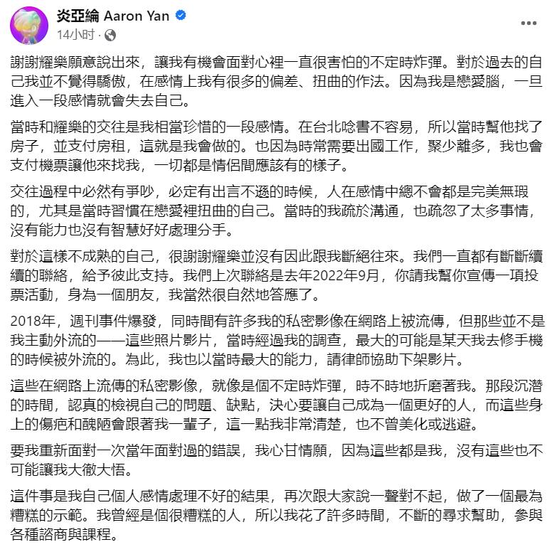 据邱耀乐爆料,影片外流后炎亚纶仅支付给自己几万元律师费,并威胁说若爆料便找黑道解决。炎亚纶昨晚发文回应,承认和耀乐恋爱,强调当时私密视频外流并非自己主观洩露,称自己也是受害者,那些私密图频也在折磨自己,每次分手因为自身原因也没有很好地结束。他感谢耀乐这几年还和自己保持联络,如果可以炎亚纶愿意当面道歉,努力修补曾经给耀乐带来的伤痕。