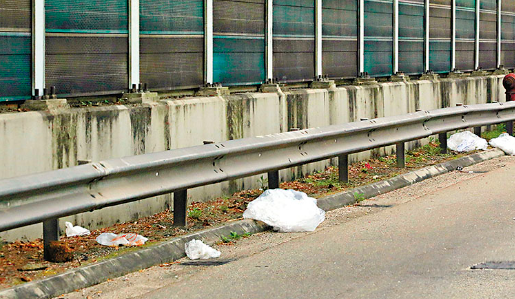 记者同时发现,公路旁边散满碎石、树枝及垃圾胶袋,一旦打风落雨被吹到水渠口,容易造成淤塞,甚至吹向行驶中的车辆。张国祥表示,一般负责公路园艺保养的公司应每月定期派出扫石机,吸走公路旁的碎石。