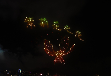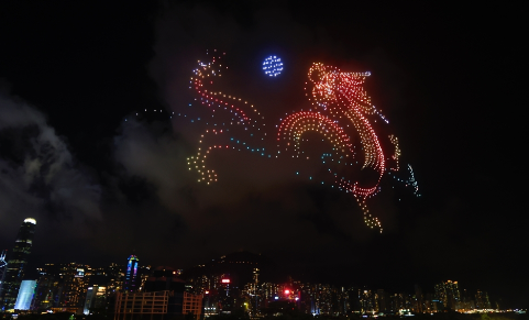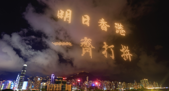 “浓浓粽叶香,岁岁皆安康,擂鼓赛龙舟,希望写香江”,夜空中,无人机队组合成多种色彩艳丽的图案,为香港市民送上端午祝福。身著民族服装的儿童手持香囊、五彩绳,奔跑跳跃,缓缓展开的粽叶照亮天际;屈原、楚辞、香草美人,独特的文化符号唤起民族的共同记忆;吃粽子、放风筝、赛龙舟,特色民俗展示营造了浓浓的节日氛围。三条龙舟奋力划行,你追我赶,转眼间,龙舟又化作巨龙,吐出龙珠,变幻成“东方之珠”高楼林立的繁华夜景,表达出“明日香港,一齐打拼”的壮志豪情。