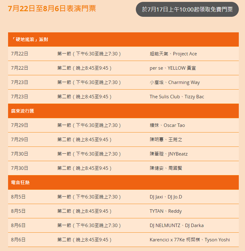 第二轮12场音乐会同样高潮迭起,王菀之、糖妹、周国贤、Tyson Yoshi等连番登场,门票数量有限,领完即止。市民即日起可登陆Discover Hong Kong网站预先登记账户,并于活动专页预览音乐会内容,拣定心水。