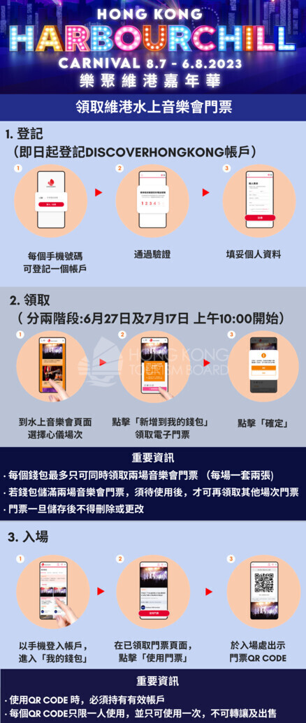 旅发局将于7月8日起一连五个周六日的晚上,于湾仔海滨一带免费为市民及旅客带来“乐聚维港嘉年华”,涵盖街头表演、极限运动表演及“幻彩咏香港”水上烟火版。当中维港水上音乐会首八场门票今日(27日)早上10时起开抢,不到一小时就已换领完毕。不过,第二轮12场音乐会门票会于7月17日(周一)上午10时开放领取,切勿错过!