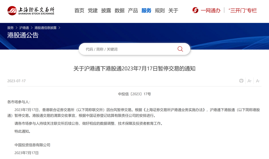 上交所公告,7月17日,香港联合证券交易所因台风暂停交易,沪港通下港股通暂停交易。港股通交易的清算交收事宜,根据中国证券登记结算有限责任公司的安排进行。