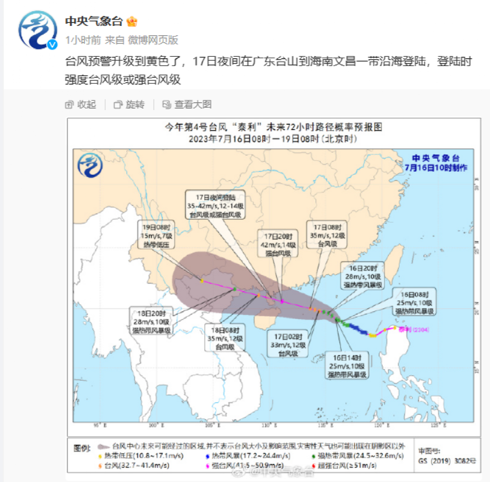 据气象部门预测,今年第4号台风“泰利”将于7月17日夜间在广东台山到海南文昌一带沿海登陆。
