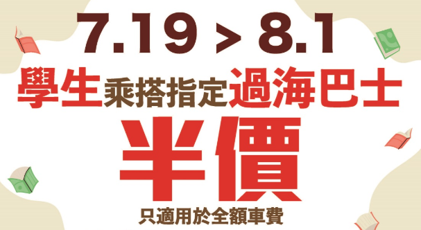 由7月19日至8月1日期间,合资格持有“学生身份”个人八达通的学生,可享30条过海线半价优惠。半价优惠只适用于全额车费,同一优惠同日内使用次数不限。