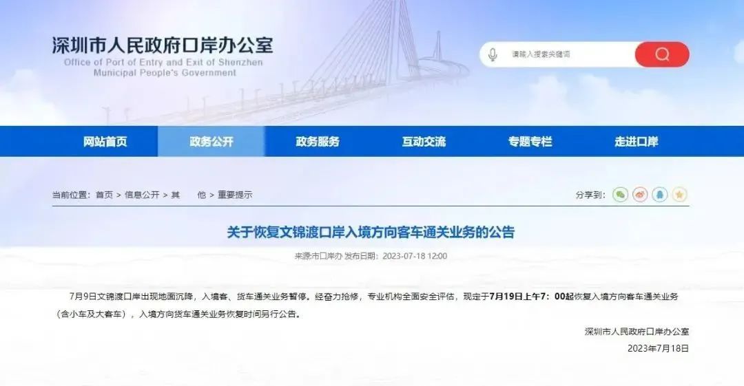 昨日深圳市人民政府口岸办公室公告指,经奋力抢修,专业机构全面安全评估,现定于7月19日上午7时起恢复入境方向客车通关业务(含小车及大客车),入境方向货车通关业务恢复时间另行公告。