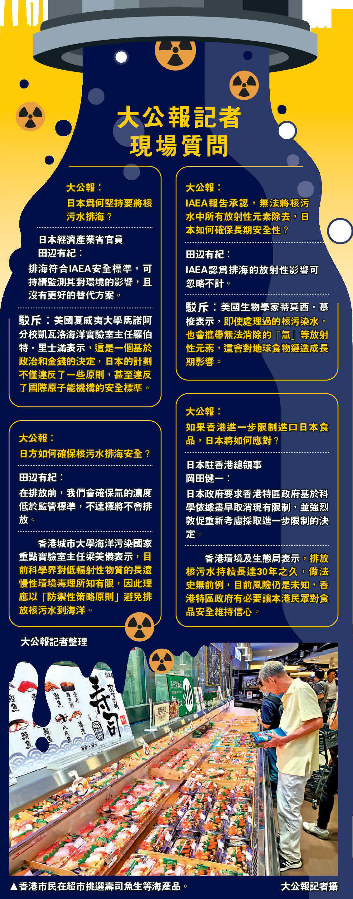 日本不顾国际社会强烈反对,坚持下月起排放福岛核污水入海。香港特区政府早前宣布,一旦日方启动排放核污水,会即时禁止10个都县的水产进口。日本驻香港总领事馆26日召开记者会,企图为排放核污水的决定洗白。总领事冈田健一不仅表示“对香港特区政府的做法感到失望”,更声称香港市民搞不清“ALPS处理水”和“核污水”的区别。日方多次以备受质疑的国际原子能机构(IAEA)报告为挡箭牌,声称核污水中的放射性元素“可忽略不计”,但相关说法早被多位国际专家驳斥,日本此举越描越黑。现场竟有日本专家称,“我可以喝核污水,但尿液排海难监控。”港人对日方的丑陋表演感到十分愤慨。