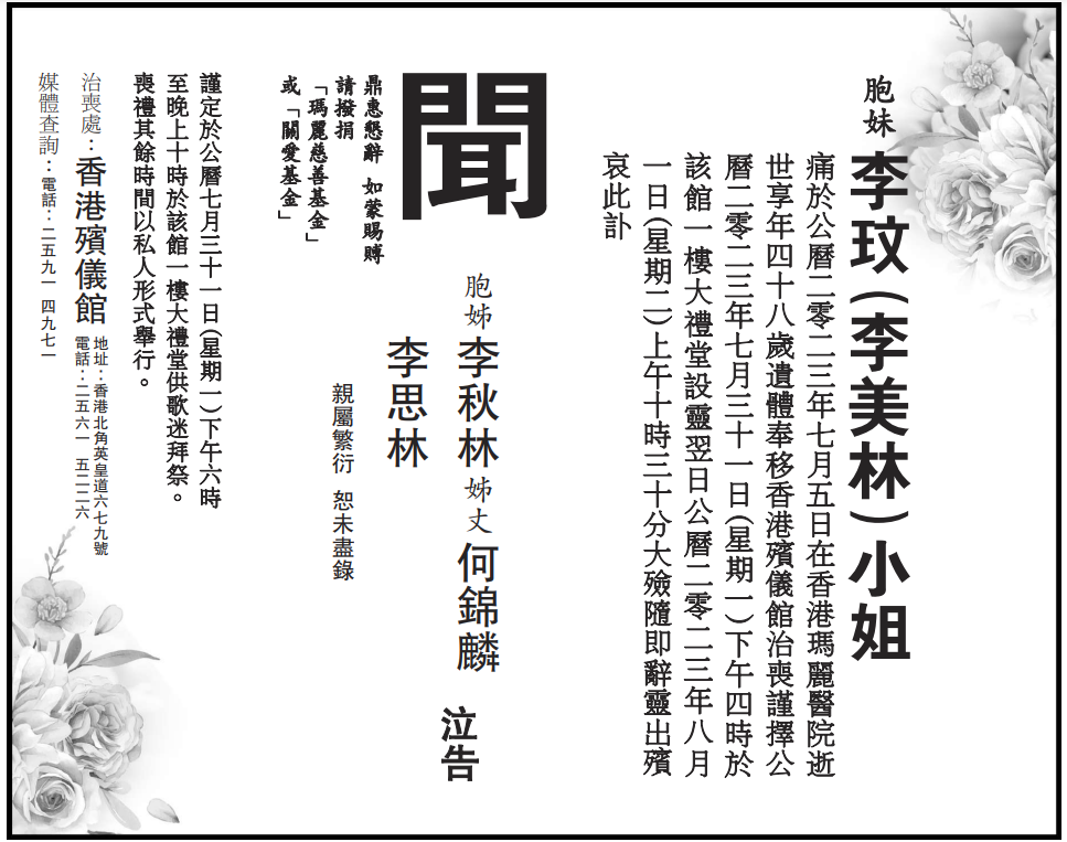 公开的讣闻以白底黑字呈现,左右角有黑白的花卉图案。讣闻上说明,李玟(李美林)遗体将移送至香港殡仪馆治丧,并于31日下午4时在殡仪馆1楼大礼堂设灵,灵堂开放31日下午6时至晚间10时供歌迷前来拜祭,其馀时间则以私人形式举行,并在8月1日上午10时30分出殡。