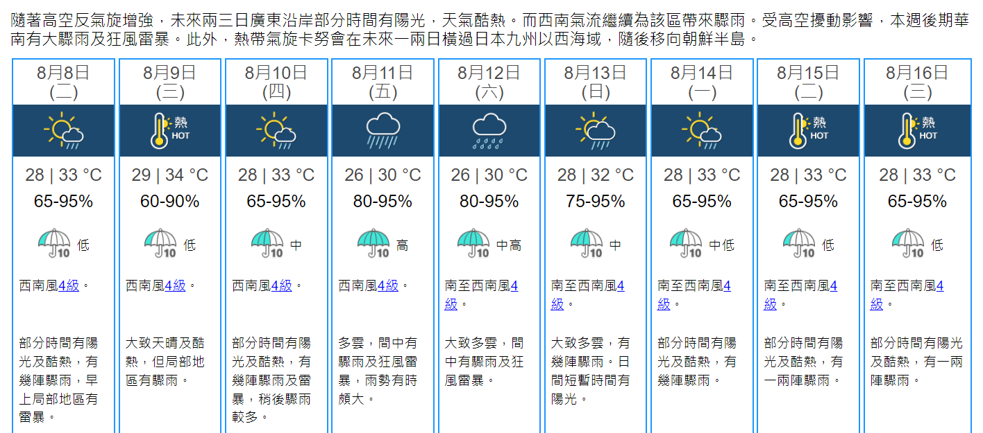 香港本星期后期天气将会转差。天文台表示,随着高空反气旋增强,未来两三天广东沿岸部分时间有阳光,天气酷热,而西南气流继续为该区带来骤雨,受高空扰动影响,本周后期华南有大骤雨及狂风雷暴。