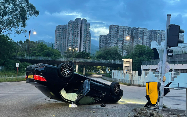 今日(20日)清晨近6时,一架平治私家车沿大埔太和路往大埔公路方向行驶,驶至近宝雅路交界怀疑失控,撞向路中一支交通灯柱及铁栏后“反肚”。