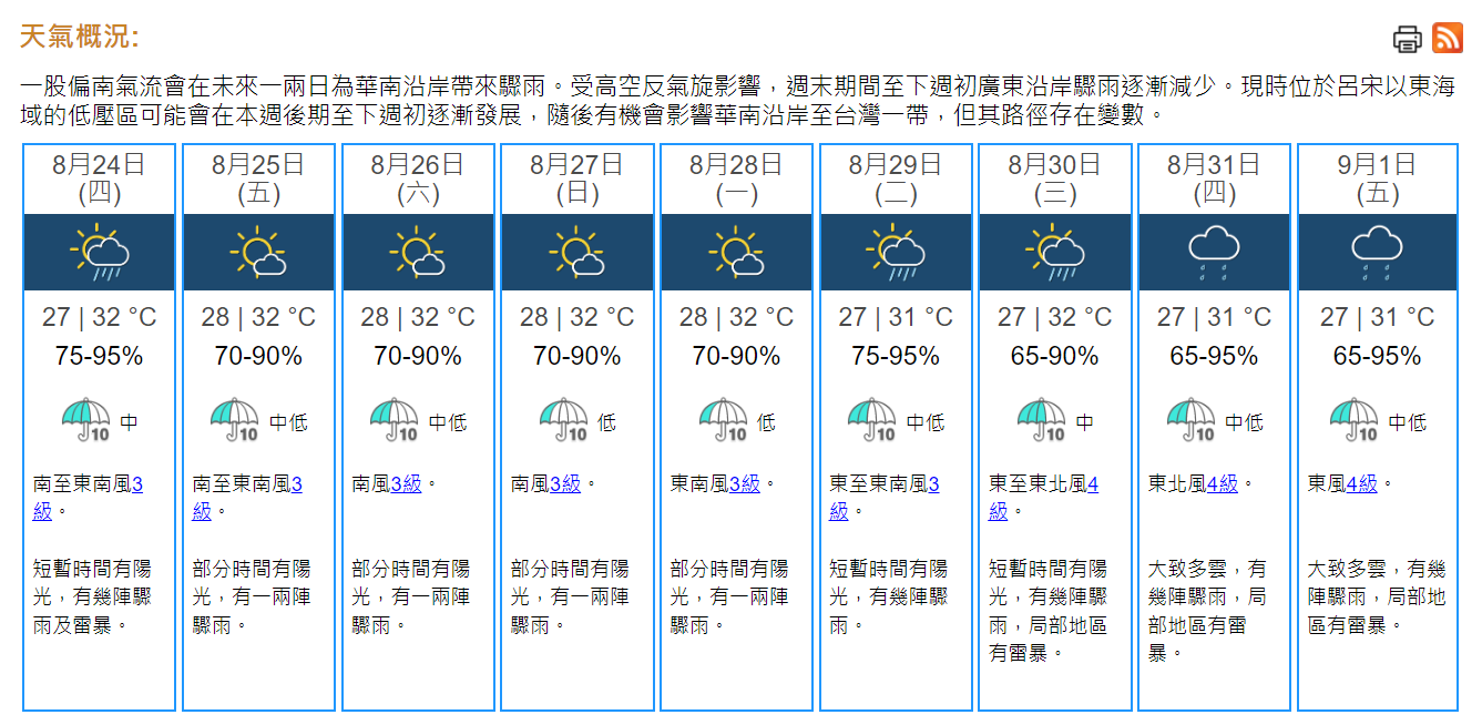 天文台指,一股偏南气流会在未来一两日为华南沿岸带来骤雨,受高空反气旋影响,周末期间至下周初广东沿岸骤雨逐渐减少。现时位于吕宋以东海域的低压区可能会在本周后期至下周初逐渐发展,随后有机会影响华南沿岸至台湾一带,但其路径存在变数。