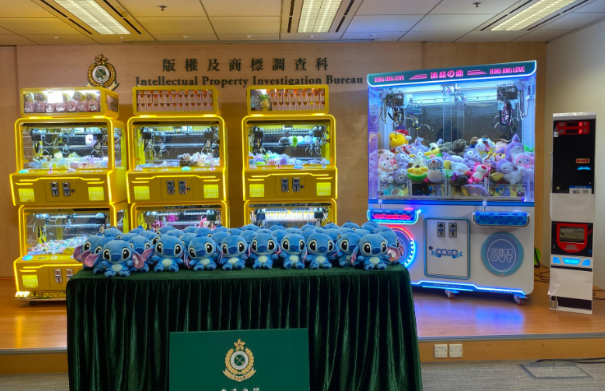 海关早前接获举报,指大埔有夹公仔店铺提供冒牌公仔。经深入调查及在商标持有人的协助下,海关人员昨日採取执法行动,突击搜查七间分别位于土瓜湾和大埔的夹公仔店舖,并检获共约一千六百件怀疑冒牌公仔和玩具、四十四部夹公仔机及七部硬币兑换机。