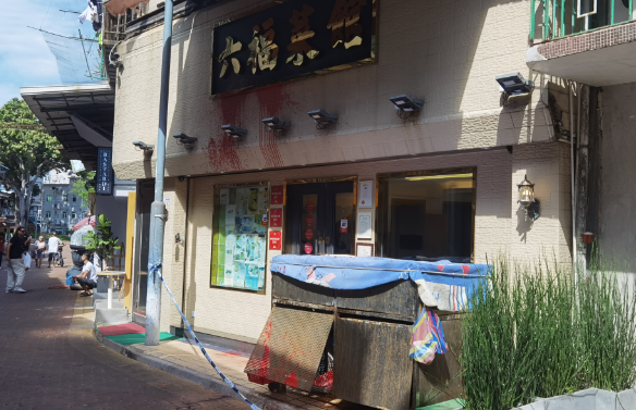 昨日(29日)早上约10时,六福菜馆亦被发现遭人喷油漆破坏,食肆的铁闸、射灯和门口地面均染有黑色油漆。警方接报到场翻查闭路电视调查,并在场检获2支水枪、部分装有黑油的蓝色环保袋及白色胶袋等,怀疑歹徒用水枪向食肆喷射油漆,正调查歹徒的动机,追缉2名戴鸭舌帽及口罩的青年归案。