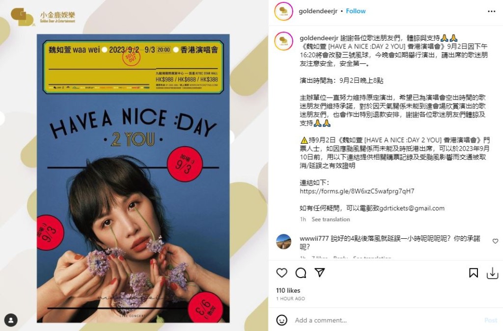 不过歌迷对此做法仍非常不满,认为很多歌迷根本难以到达现场,最终“小金鹿娱乐”再发文,“对于因天气关係未能到达会场欣赏演出的歌迷朋友们,也会作出特别退款安排,谢谢各位歌迷朋友们体谅及支持”,并指魏如萱今晚及明晚的演唱会仍会如期举行。