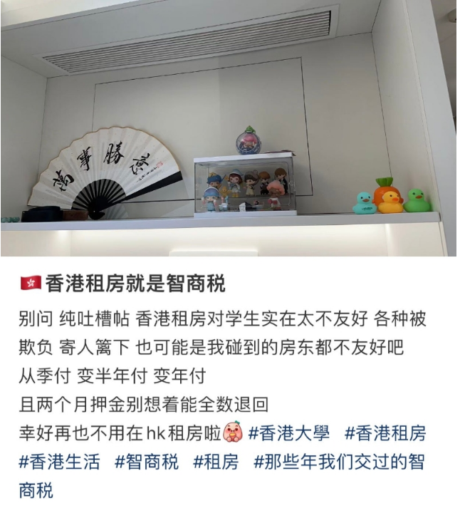 该港大内地生在小红书发文,称在香港租房“各种被欺负”,有“寄人篱下”之感。不过该内地生亦感歎“也可能是碰到的房东都不友好”,透露自己租房从季付变半年付,再变年付,两个月押金也没能获全数退回。
