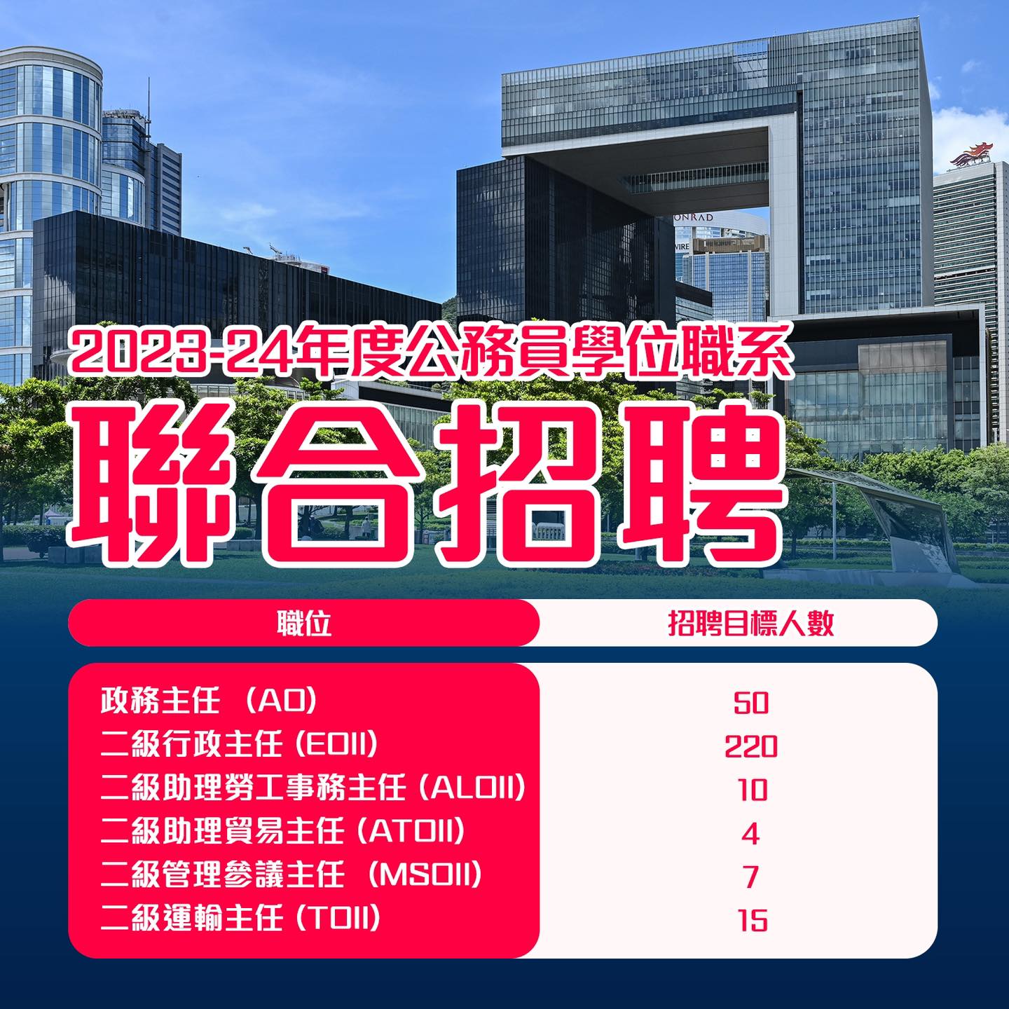 2023至24年度联合招聘政务主任、二级行政主任等6个公务员学位职系,今日(16日)开始接受报名,为期约3星期。所有符合相关入职条件的香港特别行政区永久性居民均可投考,合资格申请人会获安排参加暂定于12月2日在香港举行的联合招聘考试。公务员事务局局长杨何蓓茵在社交平台发文,鼓励有志服务社会的青年投考公务员职位,发挥自己的潜能和抱负,贡献香港。