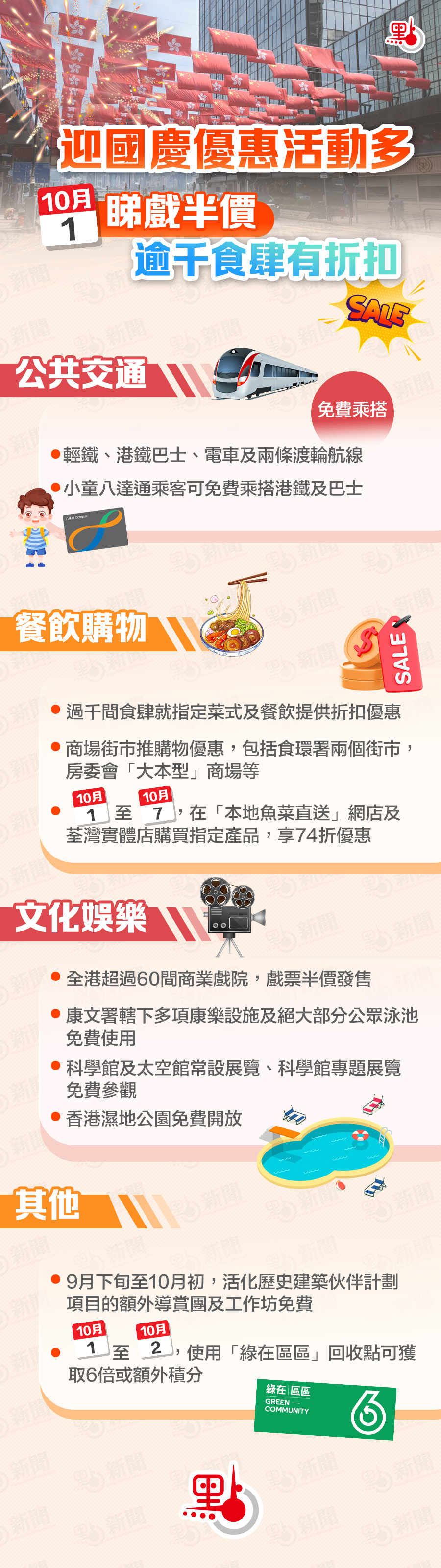 十一国庆将近,政府及公营机构将带头推出一系列活动和优惠活动,和市民一同庆祝中华人民共和国成立74周年。10月1日当日,全港商业戏院将推出半价看电影活动;市民可以免费乘搭轻铁、港铁巴士、电车及两条渡轮航线,小童八达通乘客更可免费乘搭港铁及巴士日间路线。另外,预计全港过千间食肆会提供折扣和优惠。点新闻整理各项优惠及活动,快啲嚟睇吓!