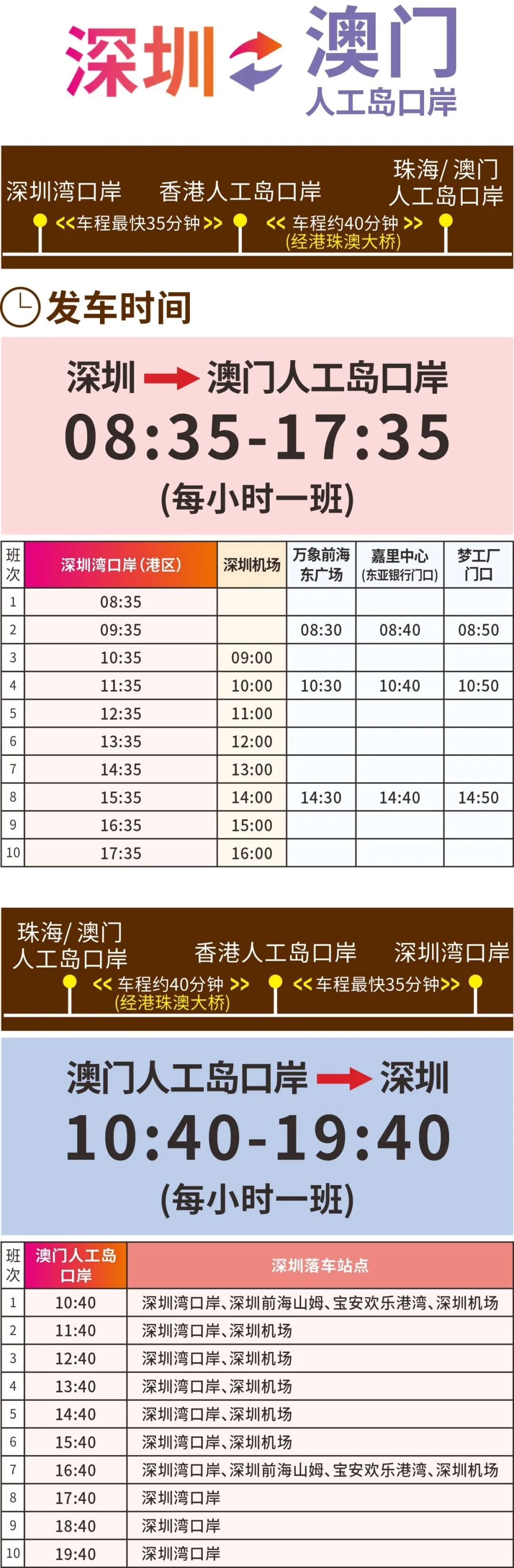 澳门人工岛口岸→深圳湾:澳门口岸过关后左手边A区车通道上车,到达港珠澳大桥(香港口岸)下车过关,入境香港后乘坐大巴(过关后右手边玻璃门出去6号车位上车),到达深圳湾口岸。