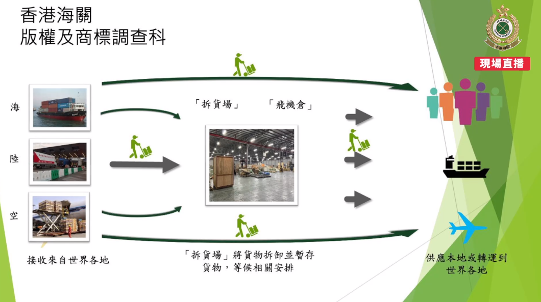 海关亦在青衣一间物流公司,检获冒牌衣服的包裹,关员根据包裹上的电话联络收货人,再将包裹送到一个黄竹坑的工厦内。行动中,海关破获一个售卖冒牌物品的迷你储存及包装中心,即场拘捕女收货货主。海关同日再拘捕一名涉嫌透过网上社交平台,以直播带货形式售卖冒牌货的女子。海关在另一次行动,拘捕一名涉嫌售卖冒牌货的商店经理。