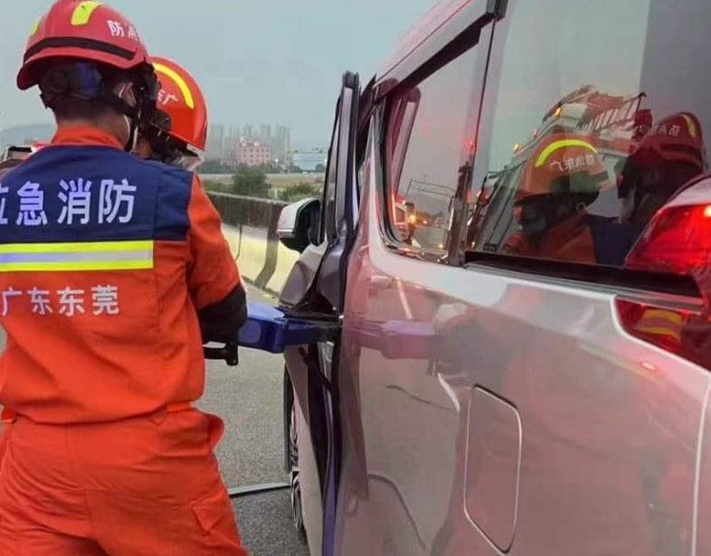 据帖文所配图片,车辆停靠路边,有身穿“应急消防 广东东莞”字眼的救援人员,用工具破开车门救人。据悉司机获救时昏迷,医护人员随即为他急救。