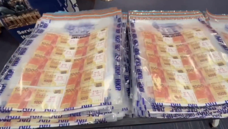 警方检获大批印有「练功券」字眼的怀疑偽钞。(直播截图)
