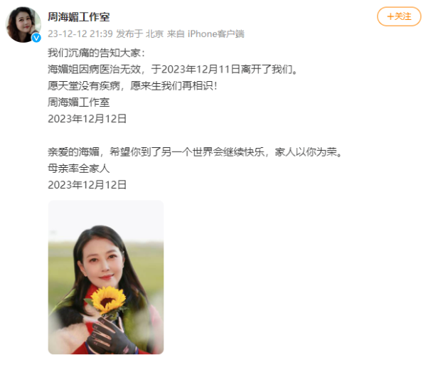 12月12日,周海媚工作室官方微博发布: