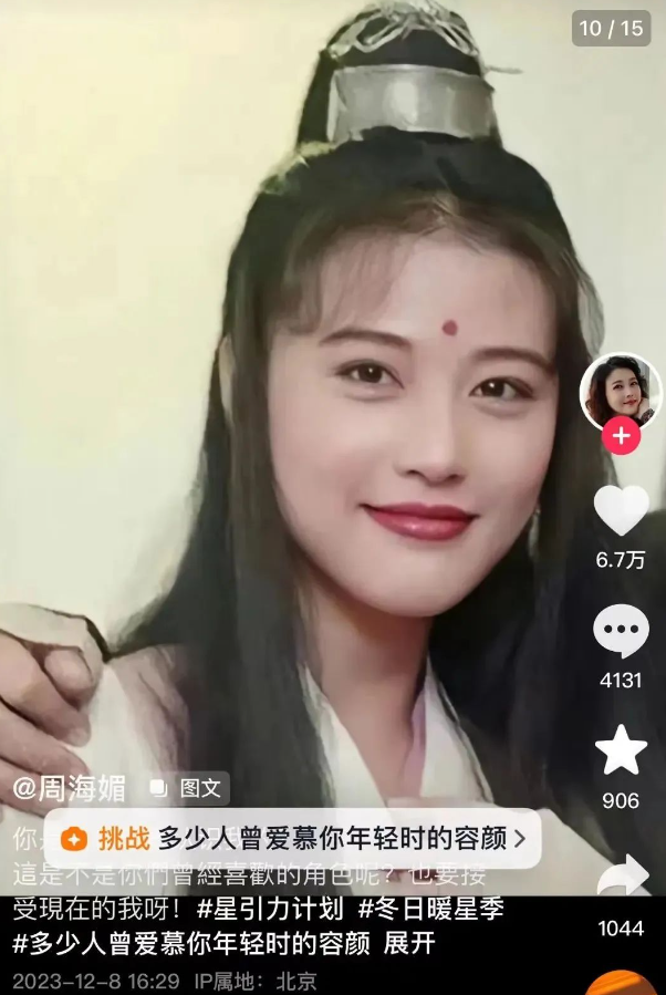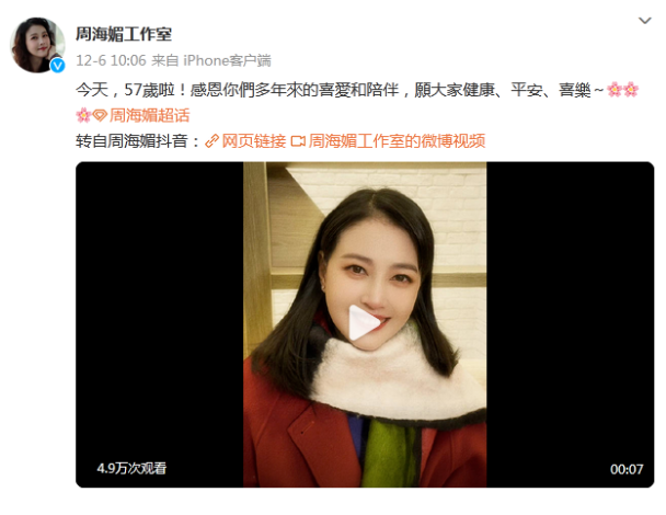 12月6日,周海媚刚刚度过了自己57岁的生日。生日当天,周海媚工作室还转发了她的短视频,并写道:“今天,57岁啦!感恩你们多年来的喜爱和陪伴,愿大家健康、平安、喜乐~”