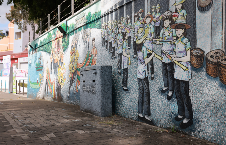 描绘沙头角传统文化活动的顺平“壁画街”。(政府新闻处)
