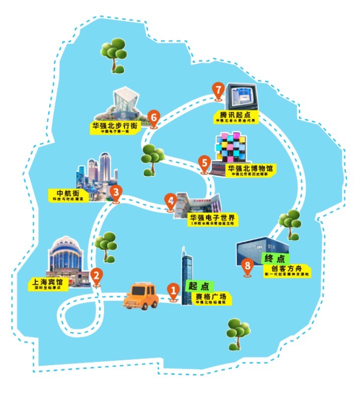 从华强北地标赛格广场出发,途径深圳坐标原点——上海宾馆,路过科技与时尚潮流兼顾的中航街&天虹购物中心,紧接着再前往华强电子世界,见证商业奇迹“1米柜枱”诞生地。下一站再到华强北博物馆,回顾华强北的传奇历史。穿过华强北步行街,在赛格科技园中见到华强北奋斗奇迹代表——腾讯起点,最后到达新一代创客精神聚集地——创客方舟,整条city walk路线都能感受到华强北随时代变迁的发展历程。