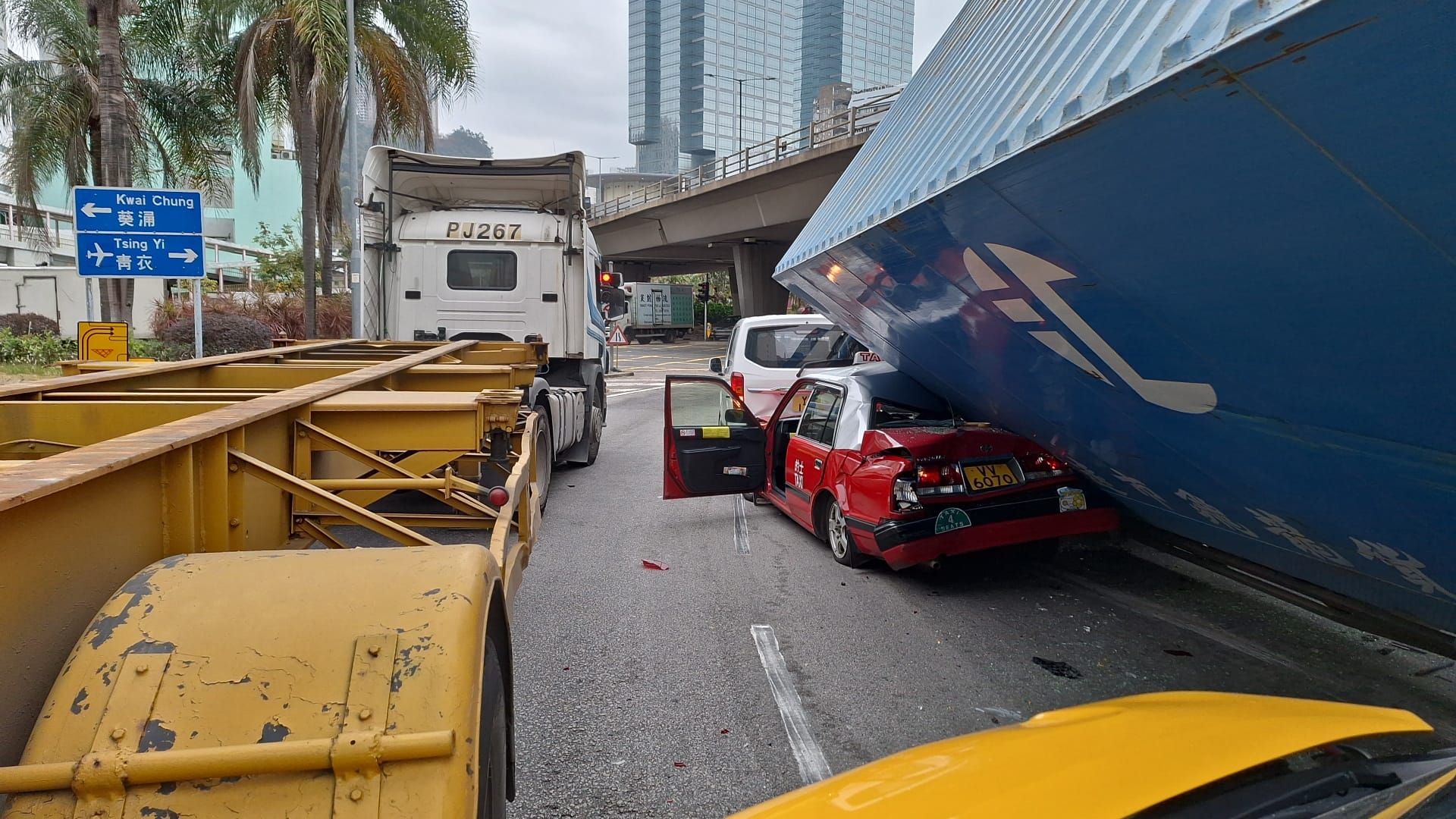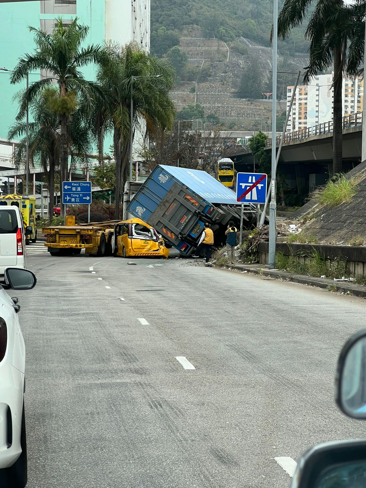 荃湾路货车疑剷壆翻侧 的士及水务署车辆被压