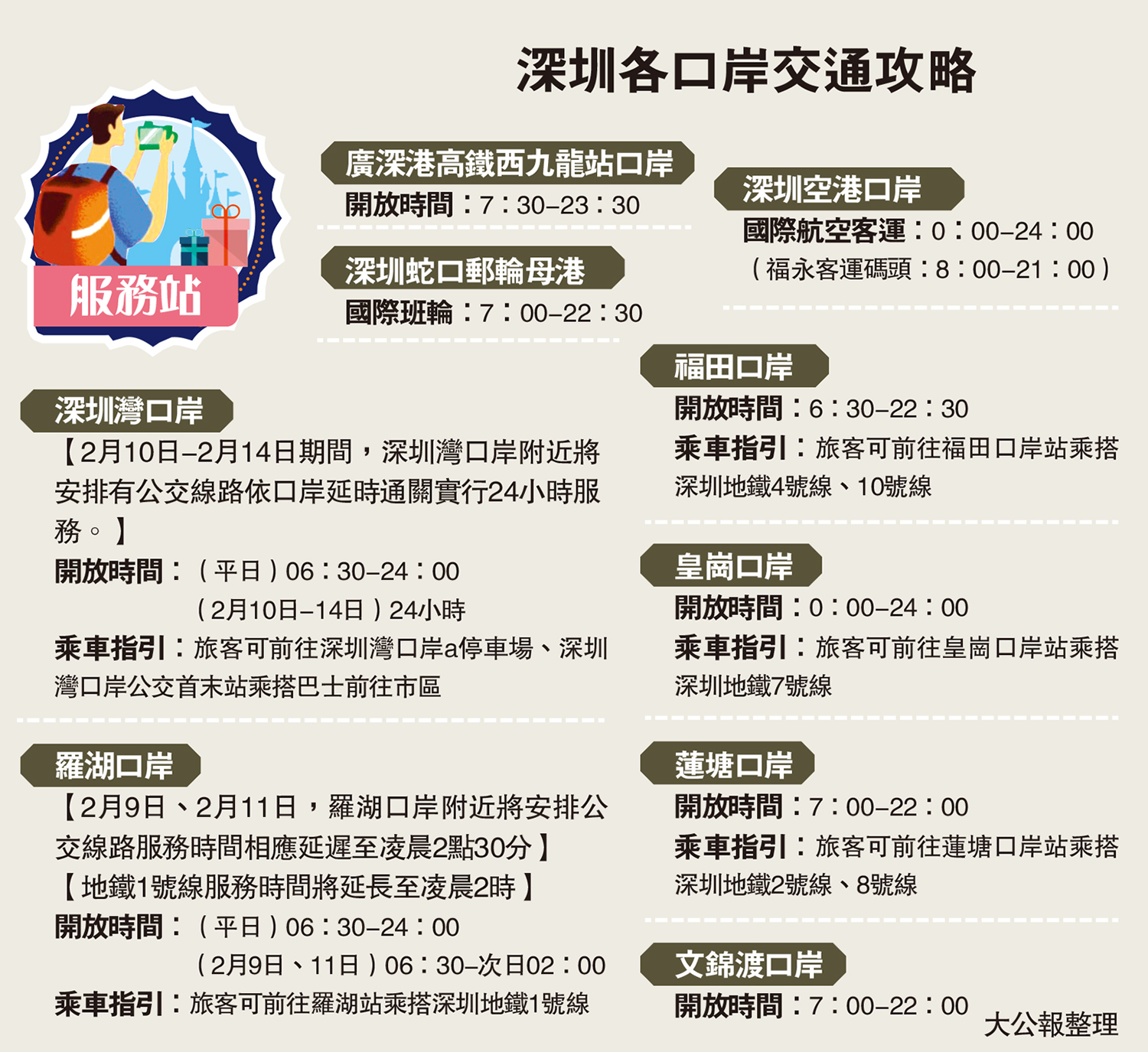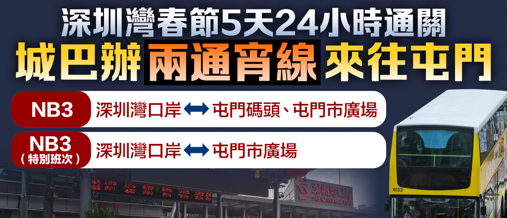 此外,据深圳交通部门消息,2月10日至2月14日期间,深圳湾口岸附近安排公交线路依口岸延时通关实行24小时服务。