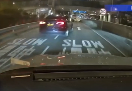 昨晚(1日)深夜11时许,一辆私家车沿元朗青山公路元朗段往朗屏方向行驶,当驶至近形点一期对出分岔位前,邻线突然有一辆Telsa电动车高速切双白线爬头,尾随一辆私家车紧随Tesla硬切线,但右尾轮胎撞向分岔位石壆后失控“头摇又尾摆”,再衝前数个车位撼向左边石壆,继而再开前约百多米后一度横亘路中,司机惊魂甫定后将车驶入巴士站“定神”。