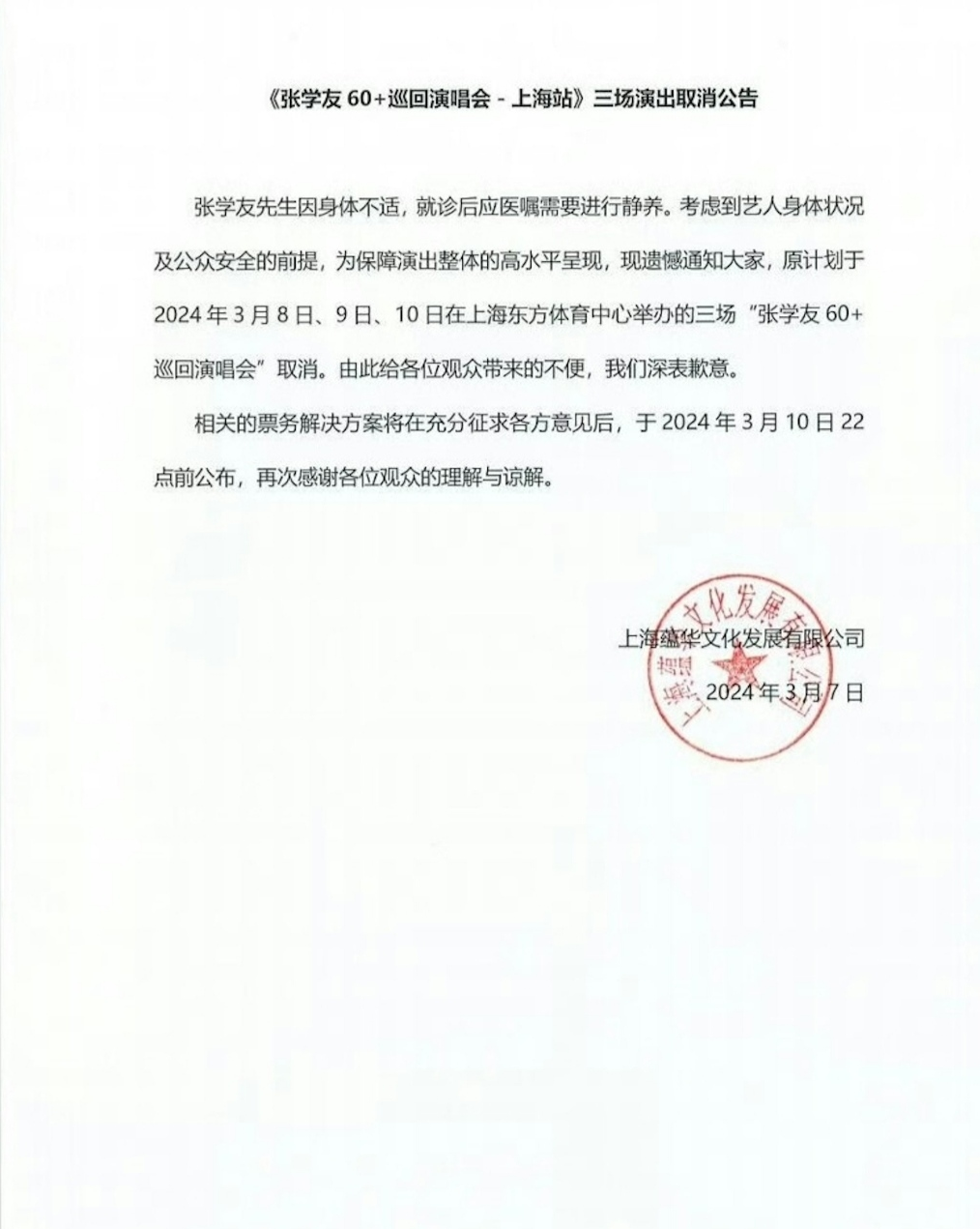 7日,张学友因身体不适在上海就医,病因疑为上呼吸道感染。演唱会主办方在微博发声明:“张学友先生因身体不适,就诊后应医嘱需要进行静养。考虑到艺人身体状况及公众安全的前提,为保障演出整体的高水准呈现,现遗憾通知大家,原计划于2024年3月8日、9日、10日在上海东方体育中心举办的三场《张学友60+巡迴演唱会》取消。由此给各位观众带来的不便,我们深表歉意。”