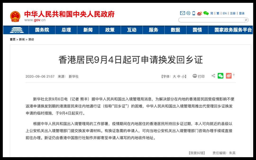 最新政策: 从9月4日起,中华人民共和国出入境管理局,将实施代受理回乡证(港澳居民来往内地通行证)换发申请的临时措施。