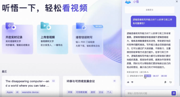 “通义听悟”此次推出的音视频问答助手“小悟”可以根据纪录内容,回答用户提问的相关话题。“小悟”支持单个纪录,多个纪录和多种语言自由问答,并提供原文位置,用户可以一键跳转回顾。用户还可以请“小悟”整理金句、梳理结论、整理会议纪要。
