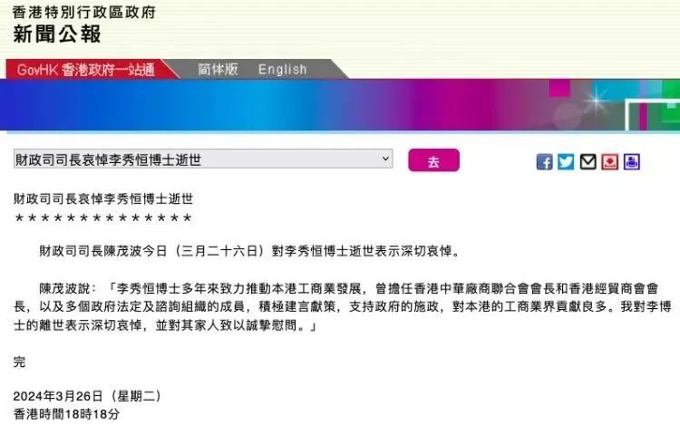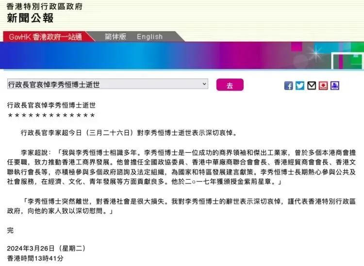 香港特区行政长官李家超3月26日表示,“李秀恒博士突然离世,对香港社会是很大损失。我对李秀恒博士的辞世表示深切哀悼,谨代表香港特别行政区政府,向他的家人致以深切慰问。”