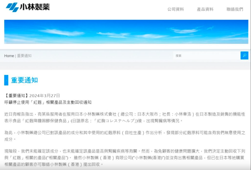 该公司指出,现阶段虽未能确定该产品是否与肾病等有关。但为免问题扩大,公司决定主动回收与“红麴”相关的产品,当中包括市民于日本等地购买的相关产品。