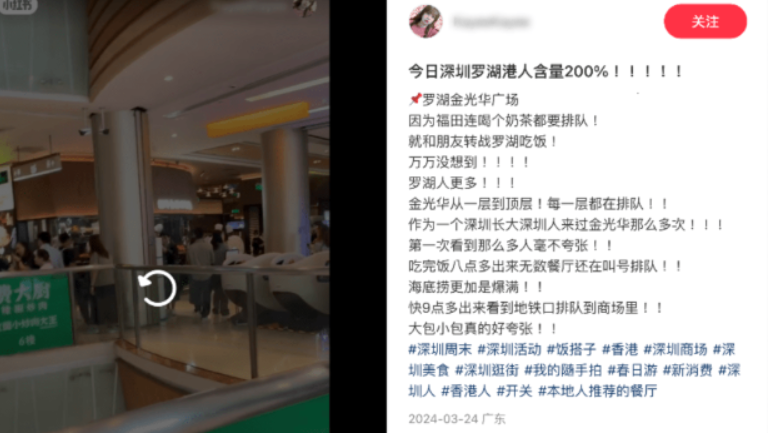 近日大量港人北上下,港铁、过关口岸、内地商场和街道都人山人海“逼爆”,相关影片亦在内地“小红书”等社交平台疯传,引来内地网民关注。