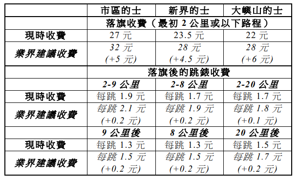 市区、新界及大屿山的士业界于2023年3月就加价申请达成共识,要求增加旗收费及落旗后的跳錶收费,的士业界早前向政府提交加价申请。