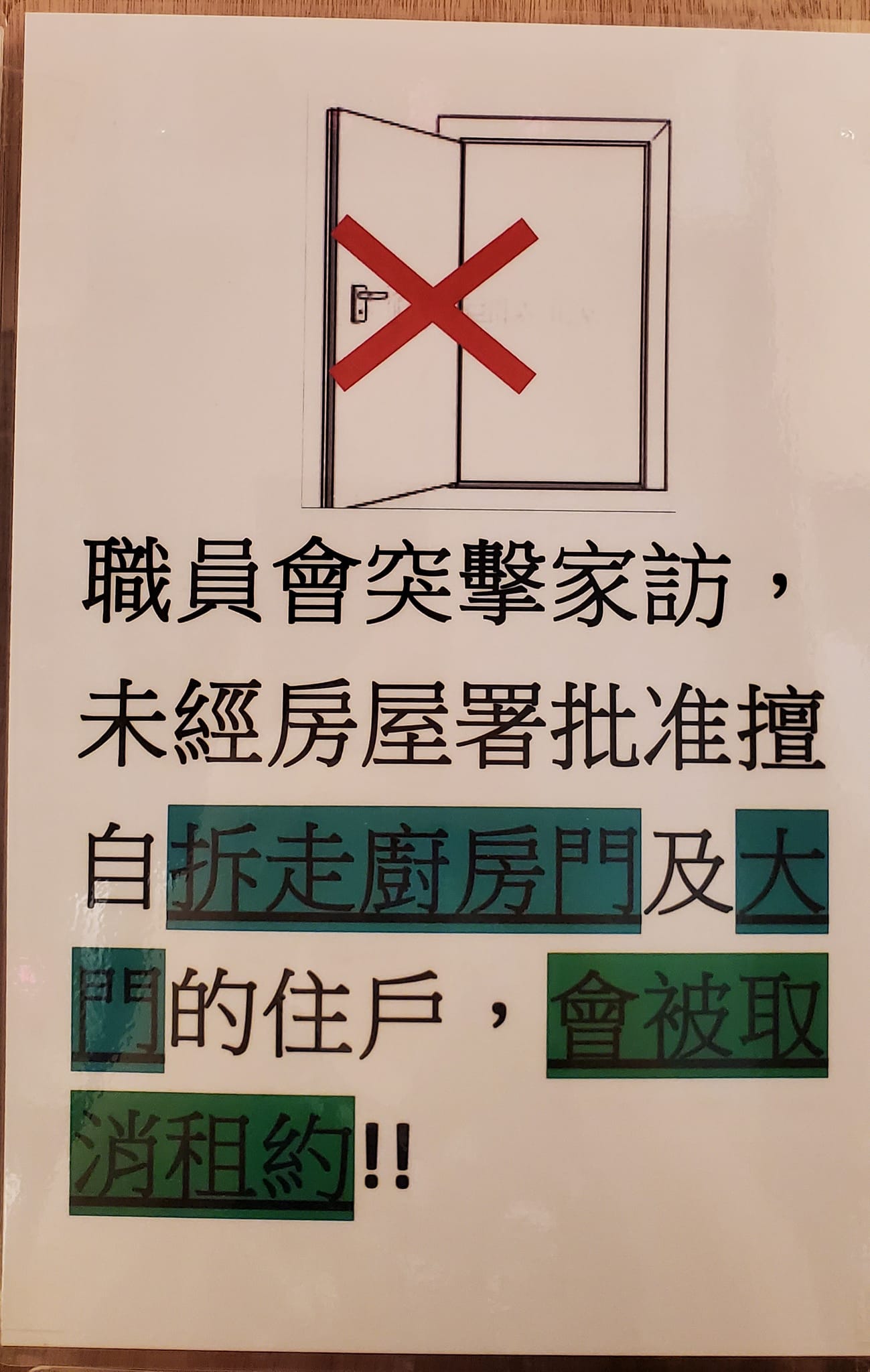 其他有网友表示“厨房门”及“大门”装有晶片,如果拆走必须装回,或经过房屋署批准就无问题;又有“过来人”称“厨房门”及“大门”两样都拆晒才会被取消租约,并透露有机会申诉。