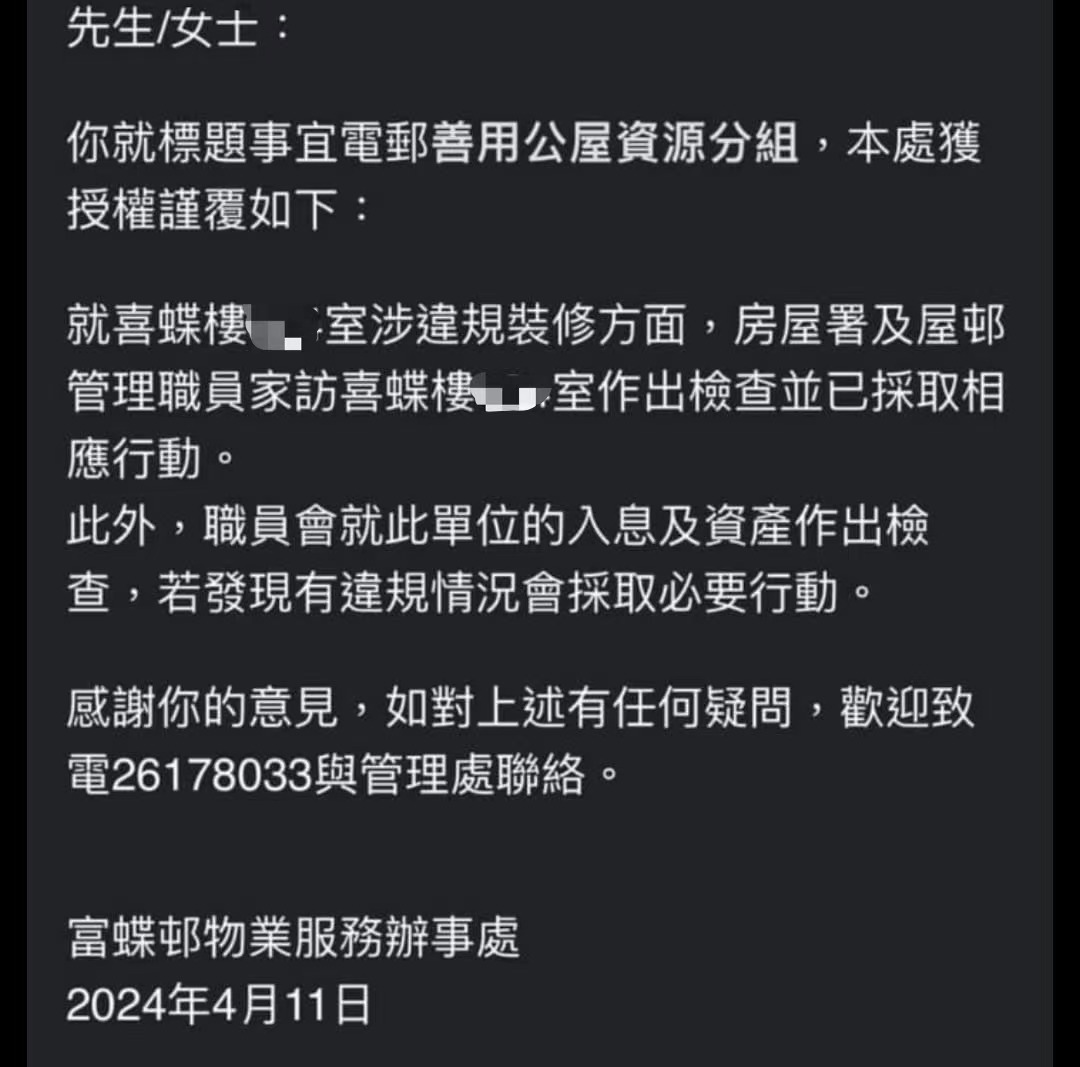 帖文随后引起热议,有网友发现该女子疑似拆走原装厨房门改成摺门,或违反房屋署“业主固定装置分类”指引;有人“预言”房署好快就会找上门,建议业主“畀钱还原啦”。未几,有网民发文证实,确实有人向房屋署举报,并于4月11日收到回覆,称房屋署及屋邨管理职员已家访喜蝶楼相关单位检查,已对有关单位採取相应行动,并指会对其进行“入息及资产”检查,若发现有违规情况,会採取必要行动。