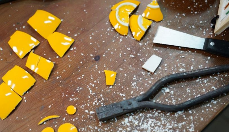 用锤子敲下碗底,再用铲子把碗壁敲成一个个大小相似的瓷片,再用钳子把瓷片修成或细长或椭圆的形状留下备用。在陈旭南的工作室置物架上,放满了这样加工后待用的细小瓷片,而这只是嵌瓷工艺的第一步。